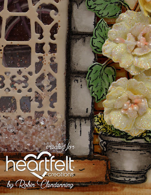 leaves and flowers around left side of card then glitter all flowers and card. Add shimmer additive to some Crystal Lacquer